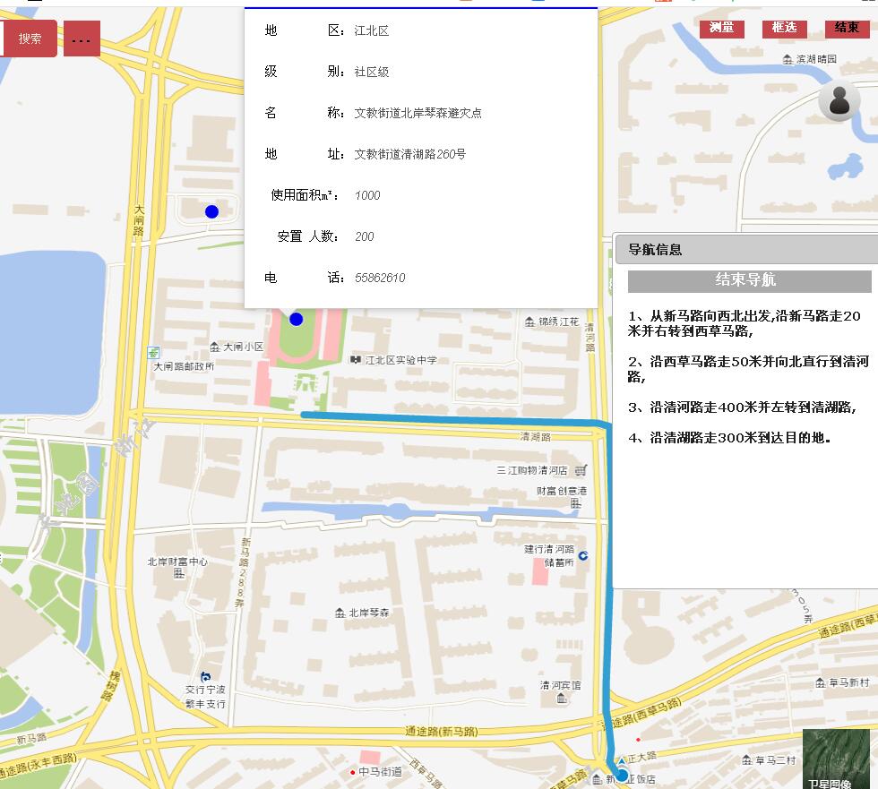 選擇就近避災(zāi)點(diǎn),點(diǎn)擊避災(zāi)點(diǎn)基本信息框上的導(dǎo)航,會(huì)顯示去該避災(zāi)點(diǎn)的行進(jìn)路線,以便群眾快速到達(dá)避災(zāi)點(diǎn)。