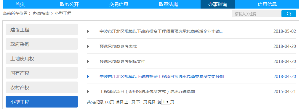 4、政策制度及辦事指南的公開。為確保小型建設工程交易過程的規范化標準化公開化,在建立預選承包商制度體系的基礎上,制訂了預選承包商項目公開交易文件示范文本以及公開交易統一表式,對公開交易過程中各個環節進行細化規定并予以公開,以方便相關當事人查閱。
