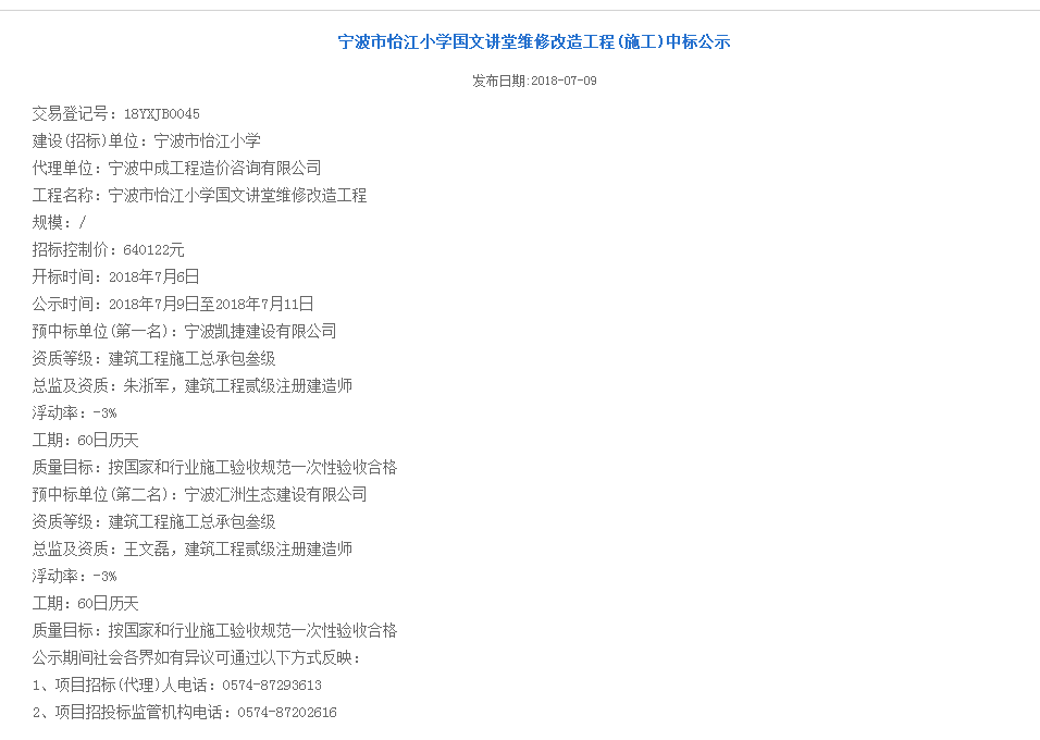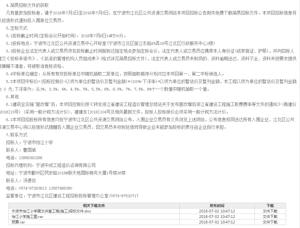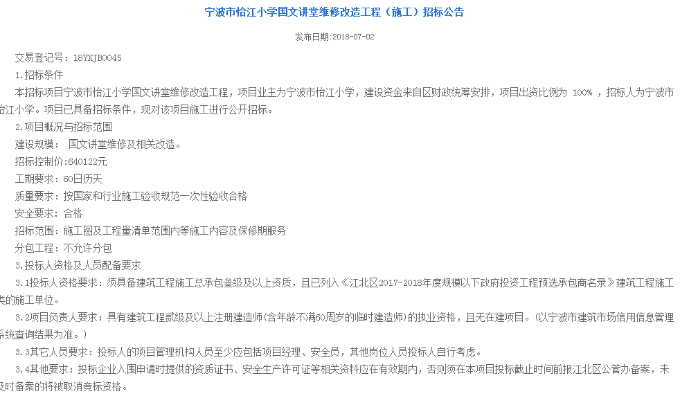 在具體項目的公開交易過程中,交易文件的備案、交易現場的監督等由各相關行政主管部門或街道(鎮)公管辦按職責實施監管。下面以外寧波市怡江小學國文講堂維修改造工程(施工)交易為例: