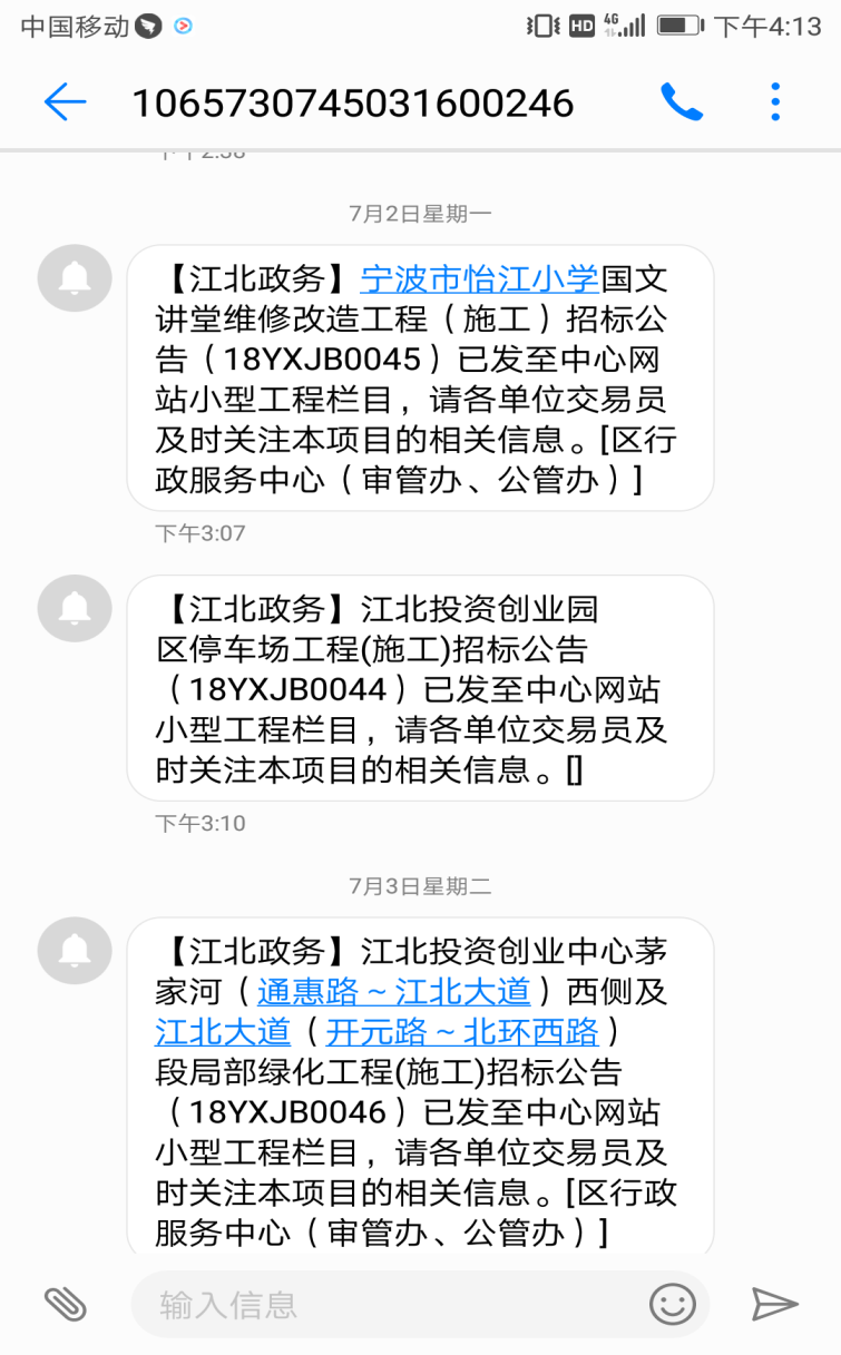 1、交易公告的發布。該項目由江北區建招辦負責監管,交易文件經備案后發布交易公告,交易公告信息公布時間不少于3個工作日,同時江北區公共資源交易中心采用短信形式通知項目所屬類別建筑工程總承包所有入圍企業,村級項目街道(鎮)平臺還需在項目所在村、街道(鎮)信息公開欄中公開。名錄庫入圍企業可免費下載交易文件(含工程圖紙、工程量清單)。