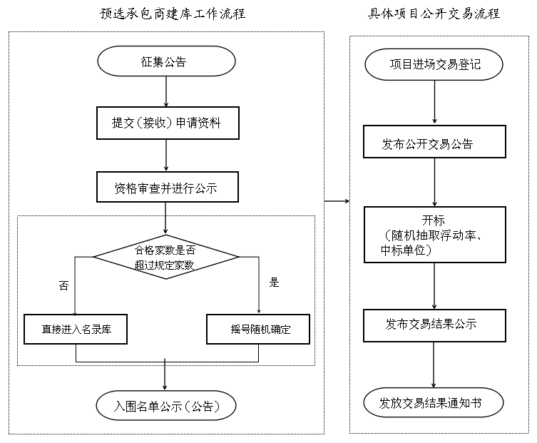 1、發布征集公告。區公管辦在商住建、城管、農水等相關行政主管部門后,確定預選承包商名錄庫征集文件并發布征集公告(含免費下載的征集文件),時間不少于10個工作日。