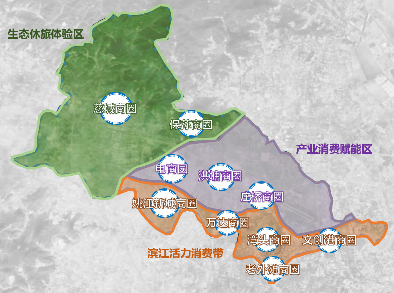以甬江、姚江濱水帶以及4號線、5號線、6號線、7號線、8號線等城市軌道交通網絡為脈絡,高起點建設濱江活力消費帶、產業消費賦能區和生態休旅體驗區,差異化推進區級核心商圈、區域商業中心、重點商業街區、社區商業網點建設布局,構建層級分明、跨界融合、模式創新的江北新型消費圈。