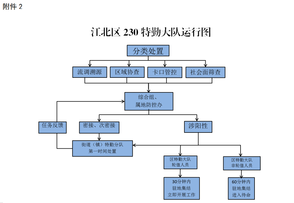 (一)由公安江北分局、區衛生健康局牽頭,區有關部門配合,落實區本級特勤大隊人員和分隊編組;研究制定具體工作流程和操作規范。開展業務培訓和實戰演練,落實集中駐點場所。