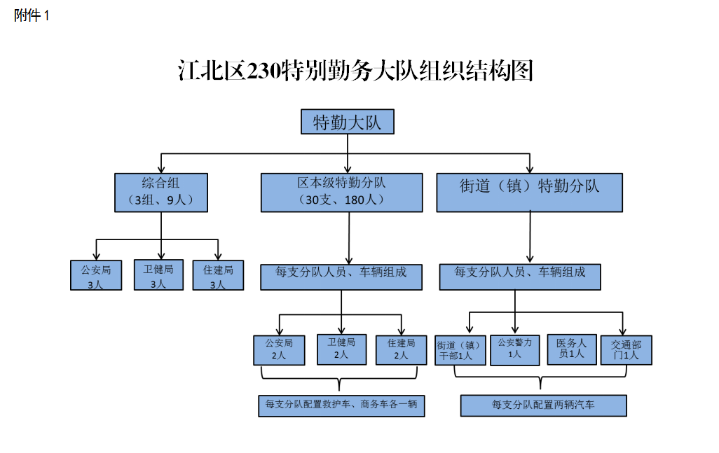 (二)區230特勤大隊下設區本級特勤分隊30支,共180人,抽調公安江北分局、區衛生健康局、區住建局(交通運輸局)各60人組成。每支特勤分隊由6名隊員組成,具體構成如下: