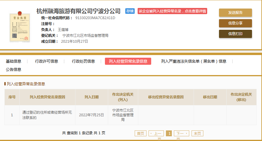 關于杭州融海旅游有限公司寧波分公司被列入經營異常單位的旅游提示