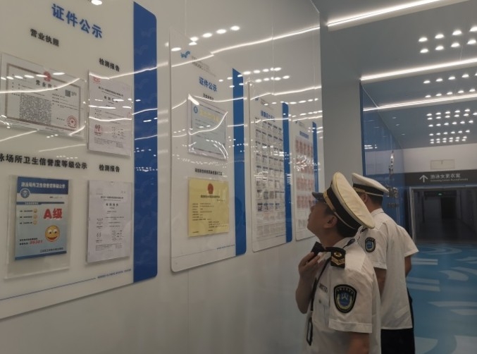 衛生執法人員圍繞游泳場所營業執照和衛生許可證的亮證情況、衛生管理制度的建立、從業人員健康合格證明的管理、各類檢測報告(泳池水質檢測、集中空調通風系統檢測和公共場所環境檢測)的公示、水質處理設施的運轉、公共用品用具的消毒管理、禁游禁煙標志的設置、泳客健康承諾制度的執行、水質在線監督監測裝置的安裝、當日泳池水質快檢數據公示等各個方面,進行了全面監督。對發現的個別游泳場所游泳者健康承諾填寫、保存不規范的問題,衛生執法人員當場進行了指導。同時委托第三方檢測機構,對7家游泳場所進行了泳池水質采樣和檢測,檢測項目包括余氯、菌落總數、大腸菌群、尿素、渾濁度、PH值等指標。