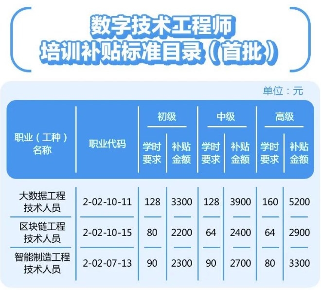 完成規定的學時和內容,且取得培訓合格證書和相應專業技術等級證書的人員,可按各市有關規定申領職業培訓補貼。省人力社保廳會同省財政廳根據國家部署,制定全省數字技術工程師培訓補貼標準,并公布各職業(工種)不同級次補貼標準。