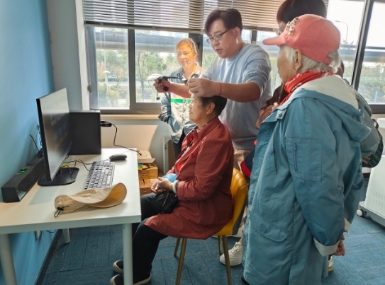 在前洋E商小鎮,寧波心翼數字科技有限公司的工作人員運用VR技術,在各類游戲中檢測老年人的認知能力,并結合智能面部檢測與大數據匯總,對老年人的身體、認知、心理情緒等方面進行專業評估后,做出相關診斷,幫助老人正確認識自身認知功能狀況。