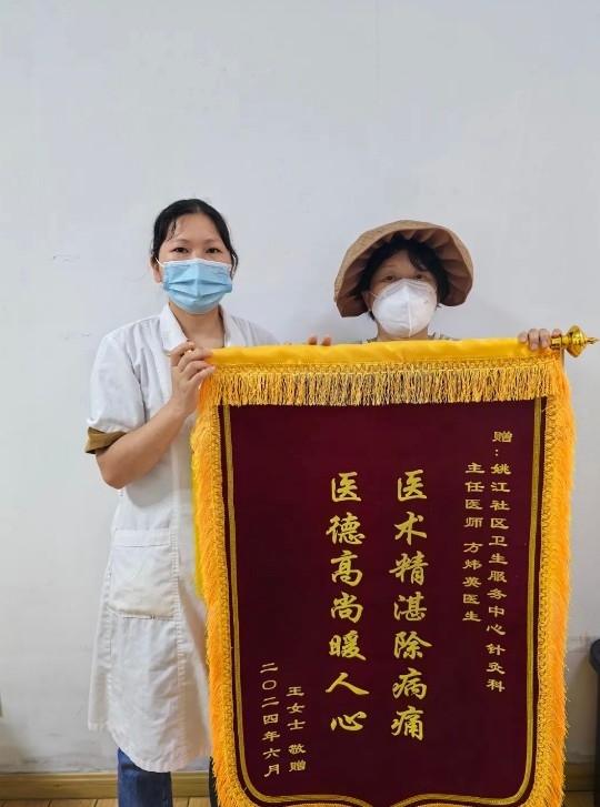 幾天前,家住江北大閘社區的王阿姨,特地來到江北區姚江社區衛生服務中心送上一面錦旗,對該中心的中醫針灸醫生方煒英贊不絕口。