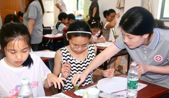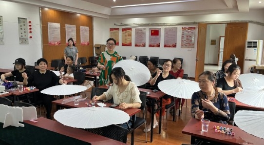 一雙雙手游走在油紙傘與顏料之間,輕輕點綴、細細描繪,純白的傘面上呈現出絢麗多彩的圖案;胡蘿卜、白蘿卜、秋葵、蓮藕等蔬菜切好橫切面以后涂上顏料,再將自然的切面轉拓到紙面上,紙面上便留下了蔬菜真實的模樣……暑期到來,莊橋街道費市社區的新業態從業人員家庭,在炎炎夏日收到了一份假日的快樂,來自浙江紡織服裝職業技術學院的大學生暑期實踐團隊,給他們帶來了油紙傘DIY、蔬菜拓印等充滿趣味和審美享受的活動課程。