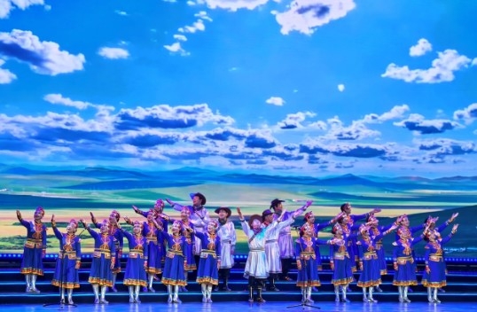 舞臺上,悠揚的馬頭琴聲緩緩響起,藝術團抒情優美的歌聲流淌著,宛如山澗中潺潺流淌的清澈溪水,緩緩沁入聽眾的心間。女隊員身著寶藍色的蒙古風裙子,裙擺搖曳,男隊員則身著潔白的蒙古裝,帥氣逼人。他們排列成雄鷹翅膀的隊形,那恢弘的氣勢與靈動的姿態,瞬間將觀眾帶入廣袤無垠的草原,忘卻塵世的煩惱。