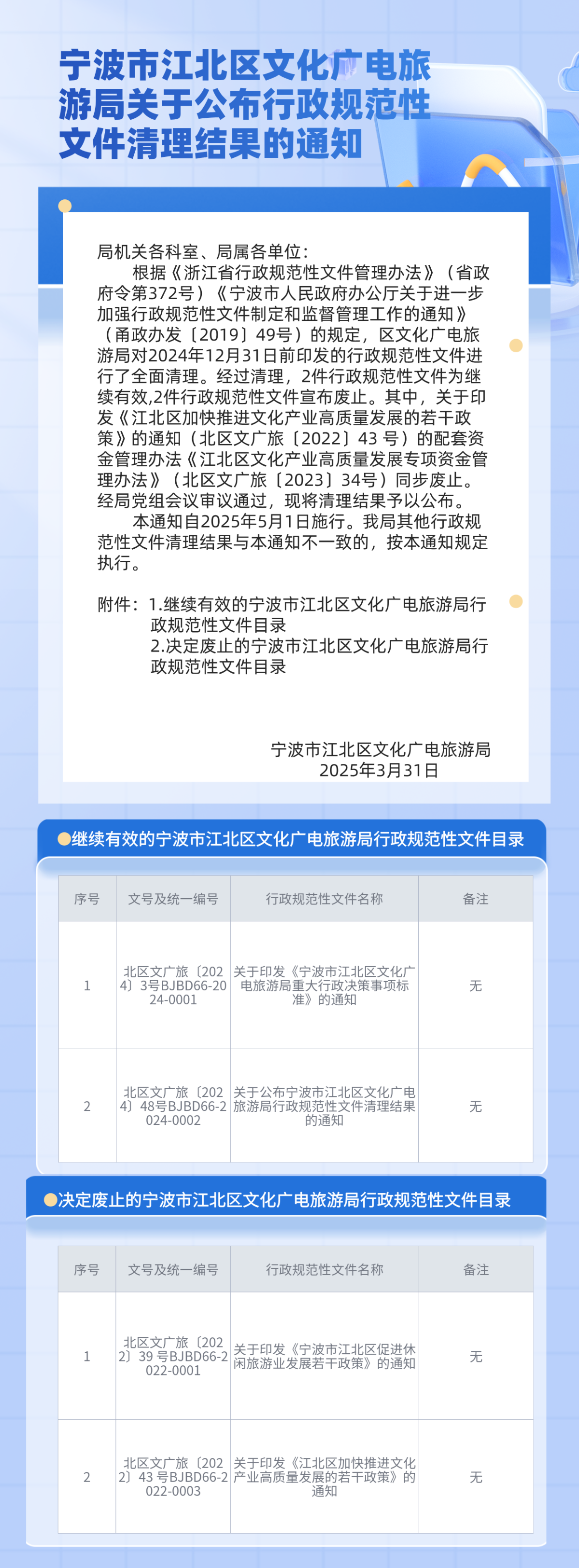 圖解《關于公布寧波市江北區文化廣電旅游局行政規范性文件清理結果的通知》