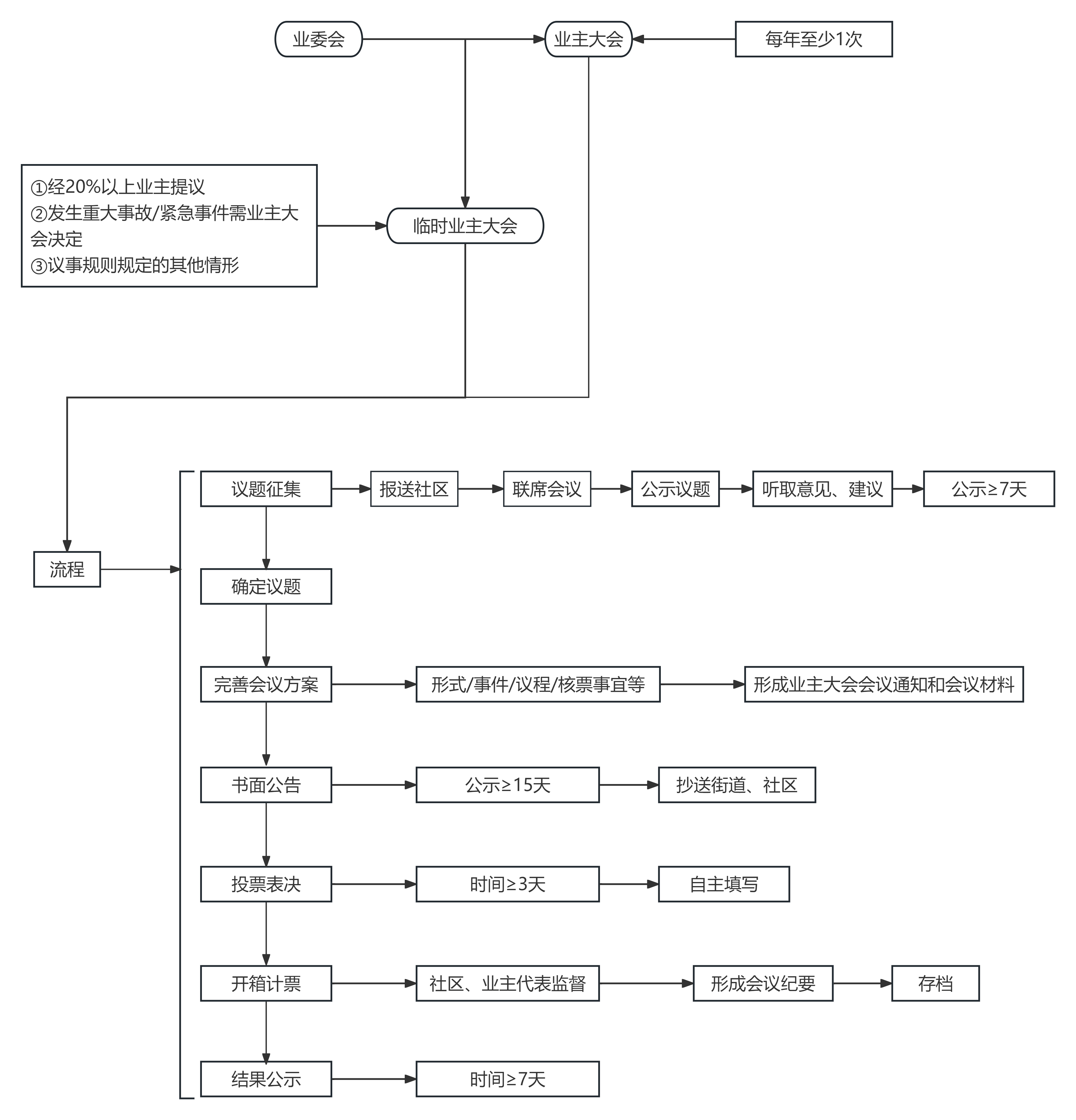 2、業主大會召開公告:議題審議確定后,業主委員會應討論決定業主大會會議時間、方式等內容,將有關材料以書面形式在物業管理區域內公示并抄送街道、社區,公示期不得少于15天。
