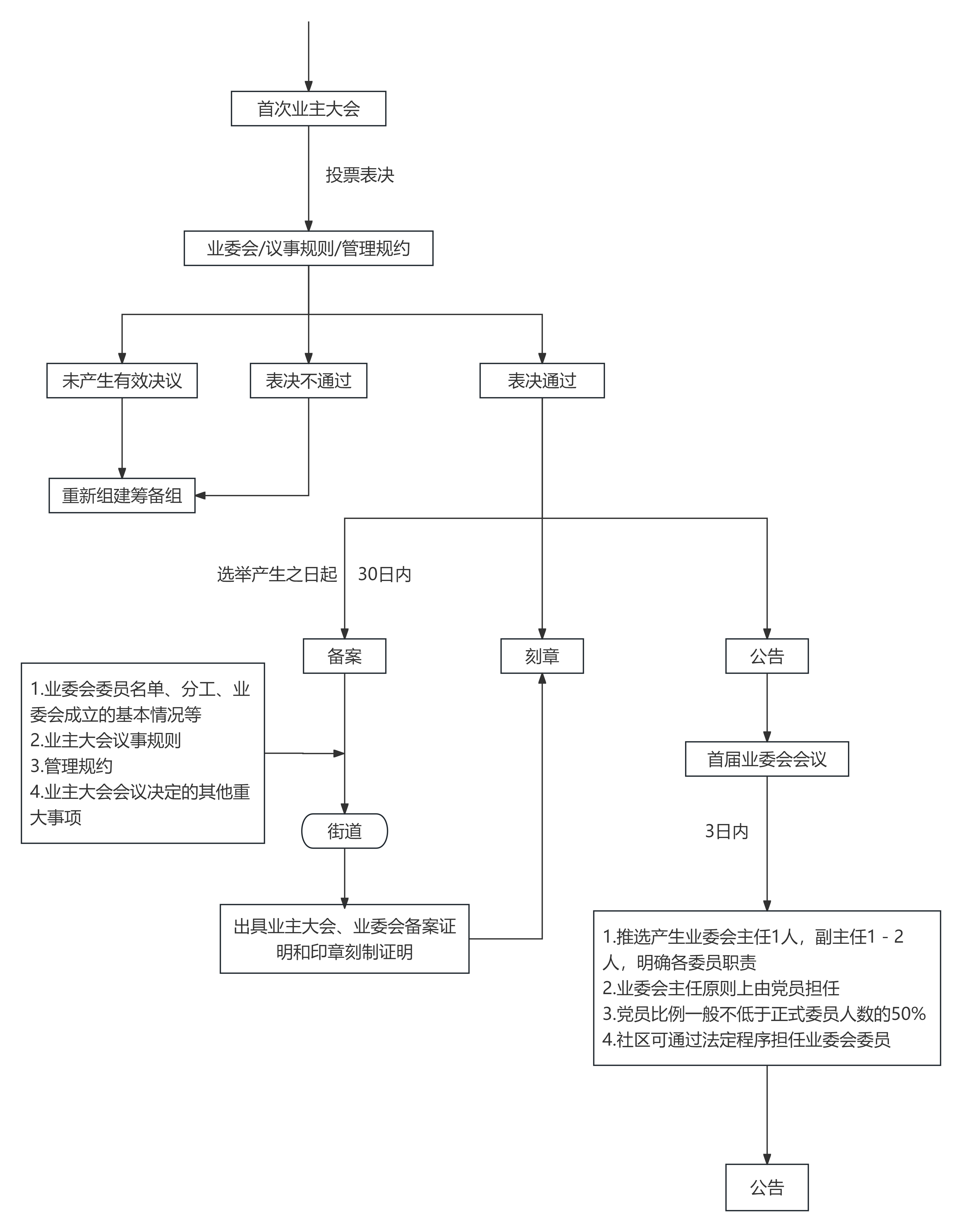 5、換屆選舉小組有關業主大會(臨時業主大會)的籌備工作職責、委員候選人條件、業主大會會議準備及召開、業主大會結果公示等流程,參照前述首次業主大會會議。