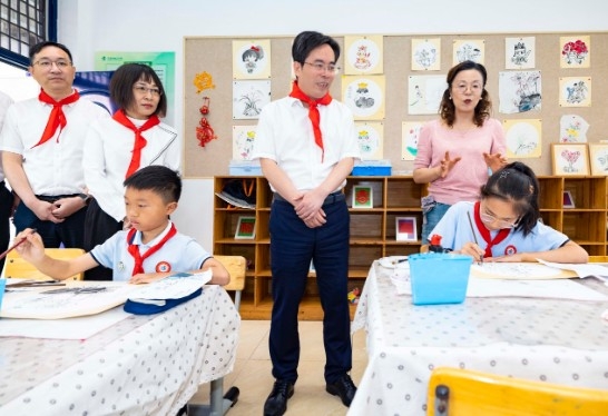 張國鋒一行首先來到寧波市怡江小學。剛踏入校園,少先隊員們便熱情地迎上前,為他們系上鮮艷的紅領巾,以最純真的方式表達歡迎。在師生的引導下,張國鋒興致勃勃地參觀了校寵館,深入了解樂學評系統(tǒng)以及學校精心策劃的六一節(jié)主題活動。在音樂室里,他駐足聆聽DOREMI合唱團的表演,對孩子們出色的演唱表現(xiàn)贊不絕口。隨后,他來到作業(yè)博物館,仔細觀賞學校收集的各類學生作品,感受孩子們的創(chuàng)意與才華。走進教室,他俯下身,專注地觀看孩子們畫蘭花,與孩子們親切交流。在學達堂,腰鼓社團的精彩表演更是贏得了大家的陣陣掌聲。張國鋒對學校的教育工作給予充分肯定,并著重強調,學校和教育部門要高度重視隨遷子女教育問題,用心培養(yǎng)好每一個孩子,同時鼓勵廣大教師堅守育人初心,做好教書育人的神圣工作。