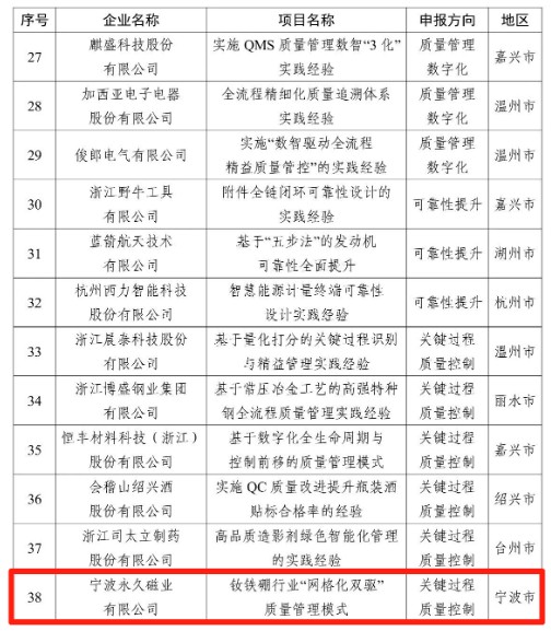近日,省經信廳公示了《2025年浙江省制造業質量標桿建議名單》,我區寧波永久磁業有限公司的釹鐵硼行業“網絡化雙驅”質量管理模式入選,系寧波唯二、江北唯一入選的企業。