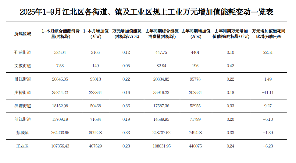 2025年1-9月江北區各街道、鎮及工業區規上工業萬元增加值能耗變動一覽表