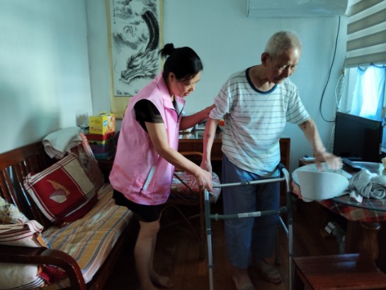 與此同時,居家養老專業人員細心為徐師傅進行護理,并對陸阿姨開展了細致的護理指導,從傷口消毒的順序、力度,到更換敷料的技巧,再到輔助恢復的肢體按摩方法,一邊耐心講解一邊反復演示。針對無力攙扶的難題,更是握著她的手示范攙扶時的發力要點和姿勢,直到陸阿姨能勉強安全地輔助徐師傅挪動,工作人員才放心離開。