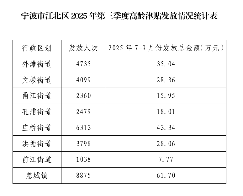 寧波市江北區(qū)2025年第三季度高齡津貼發(fā)放情況統(tǒng)計(jì)表